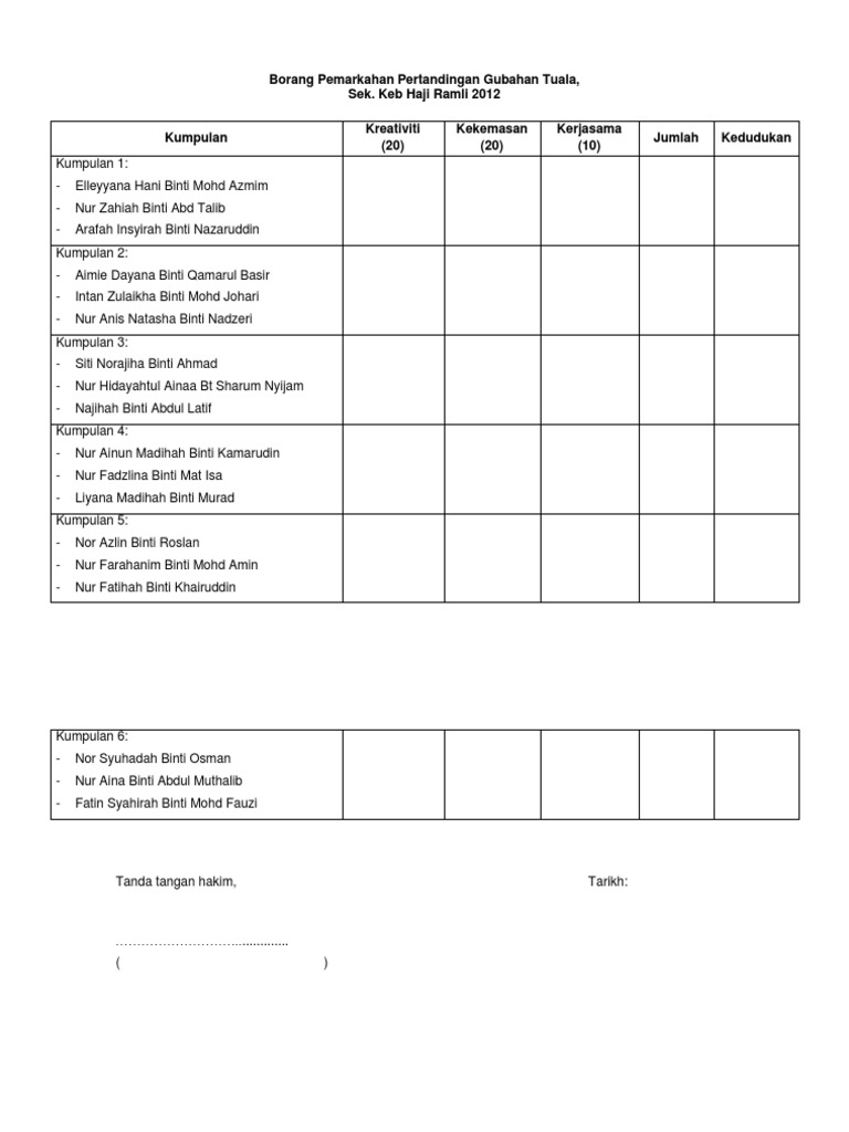 Contoh Borang Pemarkahan Pertandingan Gubahan Bunga