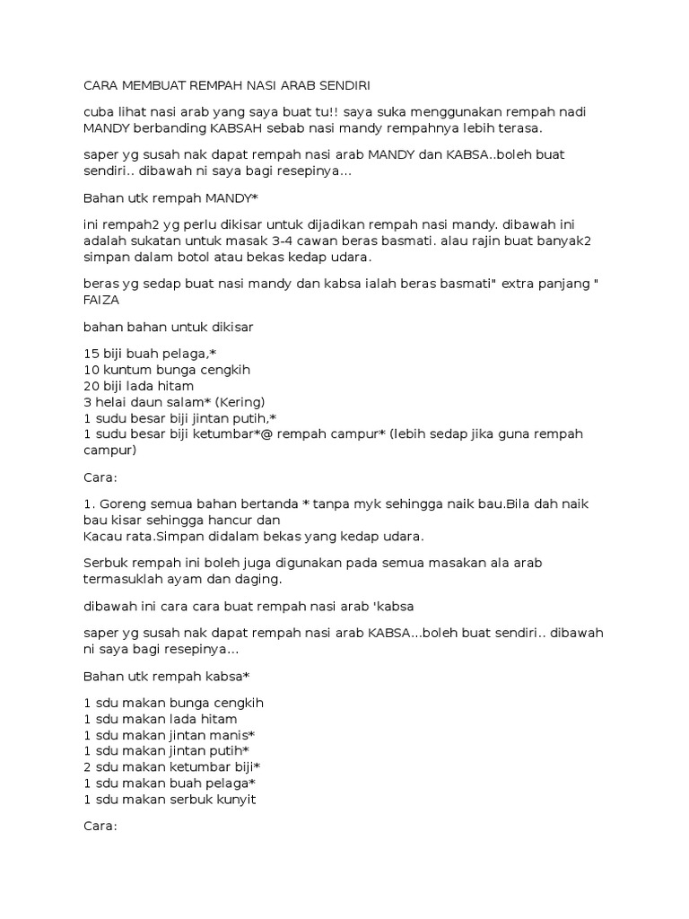 Utk bekas letak bara arang guna je aluminium bekas tutup periuk tadi. Cara membuat rempah nasi arab sendiri cuba lihat nasi arab yang saya buat tu. Dipasaran memang banyak pilihan pes namun kita tidak pasti mana satu memberikan keaslian rasa nadi arab sebagaimana yang diingini. Menyediakan menu istimewa untuk keluarga tercinta tentunya nasi arab boleh dijadikan pilihan.