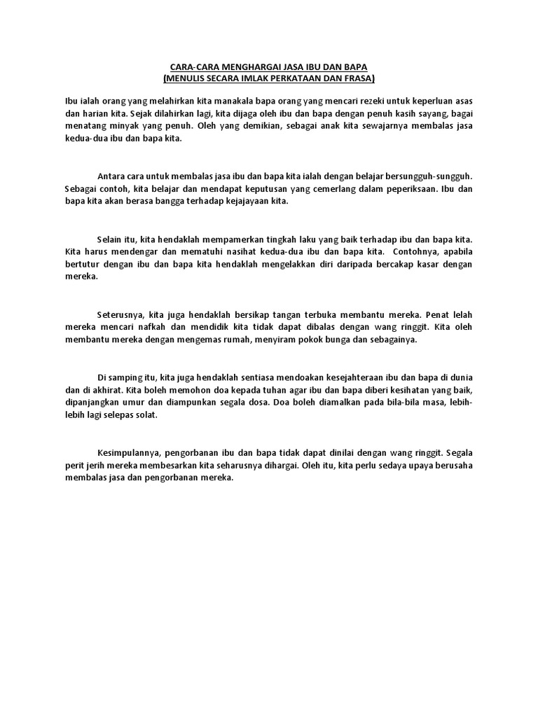 Cara membalas jasa ibu bapa. Bukan mudah nak balas jasa ibu bapa. Ibu dan bapa kita akan berasa bangga terhadap kejajayaan kita. Berikan pendapat kamu cara cara yang patut dilakukan untuk membalas jasa kedua dua orang tua kita setiap insan sudah pastinya mempunyai ibu bapa. Kita boleh memohon doa kepada tuhan agar ibu bapa diberi kesihatan yang baik dipanjangkan umur dan diampunkan segala dosa.