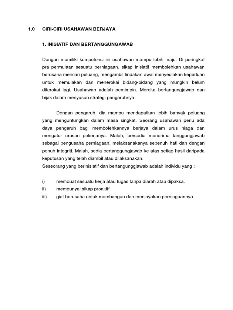 Ciri usahawan ini sangat penting untuk menjadi seorang usahawan yang berjaya. Inisiatif dan bertanggung jawab. Contoh usahawan ialah dato yusof haslam yang merupakan pengarah filem yang terkenal di malaysia.
