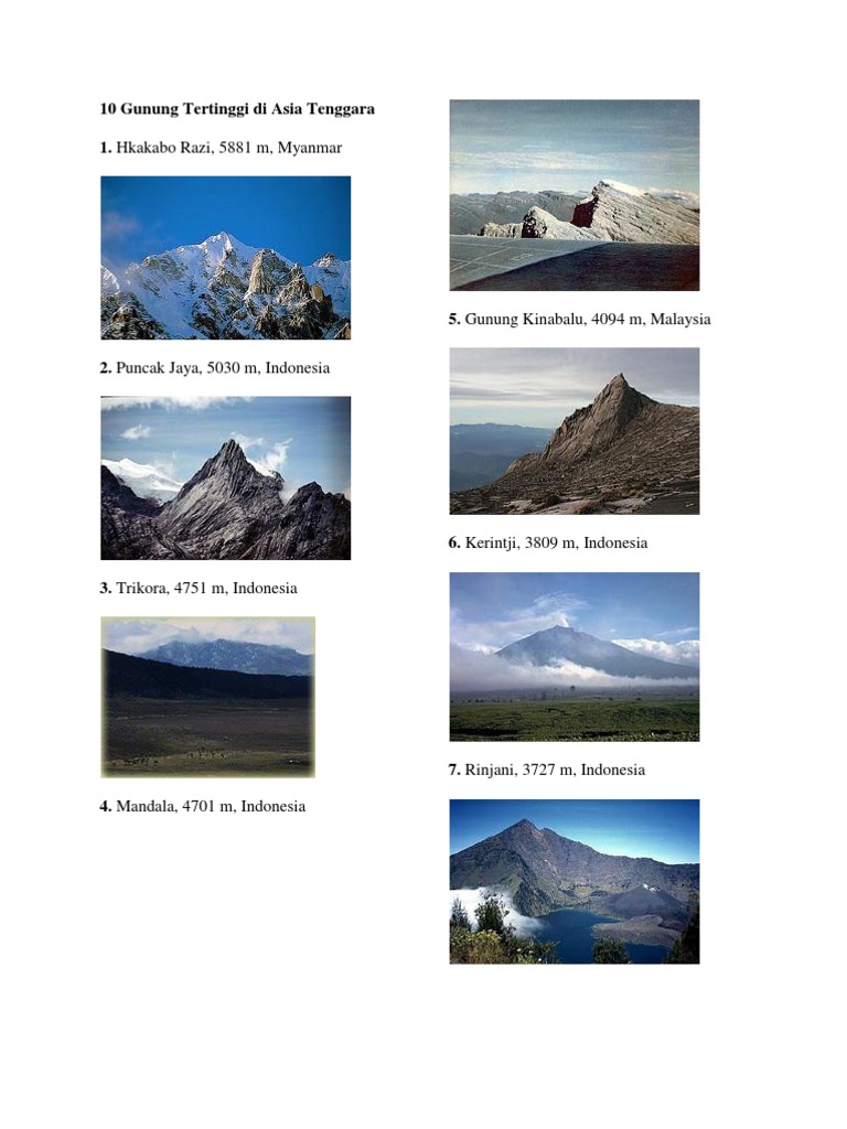 Gunung ini adalah gunung kedua tertinggi di indonesia setelah puncak jaya wijaya. Gunung tertinggi di malaysia dengan ketinggian mencapai 4 095 meter di atas permukaan air laut dan berada di pulau kalimantan tepatnya berada disabah malaysia selain dianggap sebagai simbol atau lambang kebesaran yang dipercayai dan diyakini bisa memberikan semangat persatuan diantara mereka gunung kinabalu juga memiliki mitos yang dipercaya oleh suku kadazan disabah gunung kinabalu dipercaya sebagai tempat bersemedinya jiwa jiwa orang yang sudah meninggal. Gunung tertinggi yang ada di asia tenggara jatuh kepada gunung hkakabo razi yang berada di kawasan myanmar. Yaap gunung yang memiliki ketinggian sektiar 5 881 meter di atas permukaan laut ini memang memiliki keunikan serta pemandangan alam yang indah.