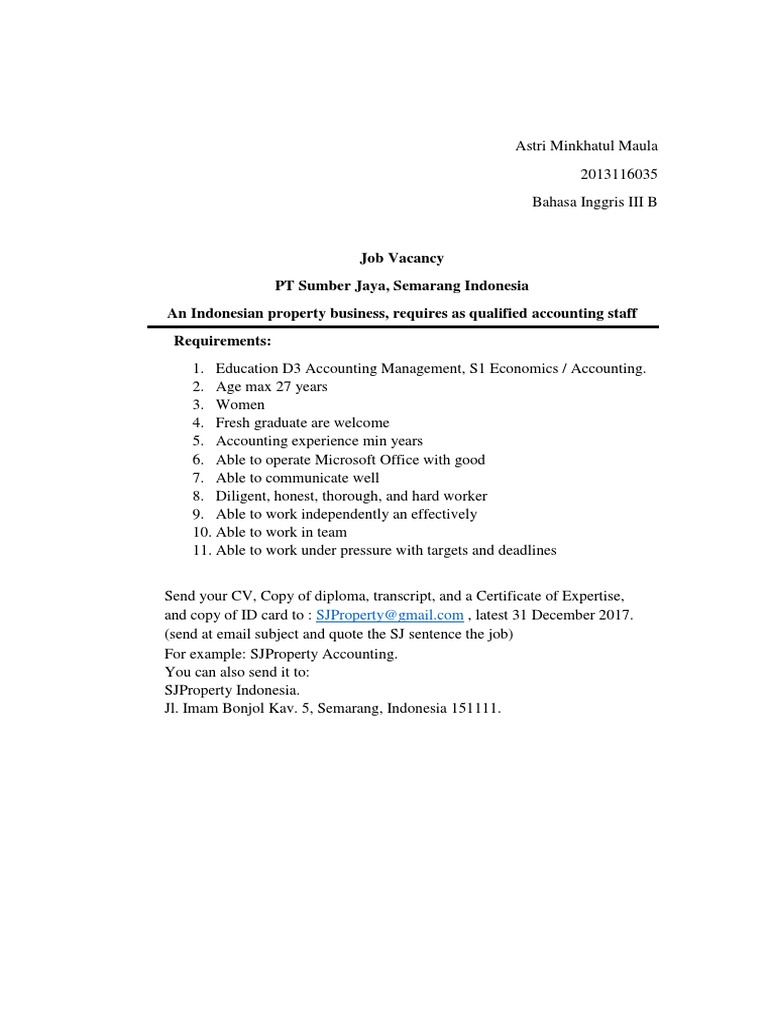 Job Vacancy Pt Sumber Jaya Semarang Indonesia An Indonesian Property Business Requires As Qualified Accounting Staff Requirements Business Personal Growth