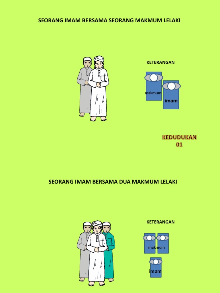 Kedudukan imam dan makmum. Kedudukan imam dan makmum makmum yang terdiri daripada seorang sahaja hendaklah berdiri di sebalah kanan dan terkebelakang sedikit daripada imam. Ketika makmum mula mengikuti imam sekurang kurangnya imam sudah pun membaca al fatihah dan makmum tidak sempat menghabiskan bacaan al fatihah apabila imam rukuk. Kedudukan makmum berseorangan dalam solat jemaah. Posisi imam lelaki dan makmum.
